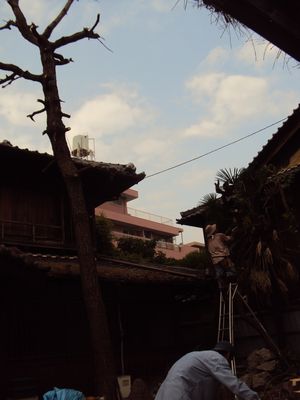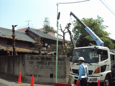 こういう狭いところの木でも、ロープなどを使って建物をいためずに伐採できます。