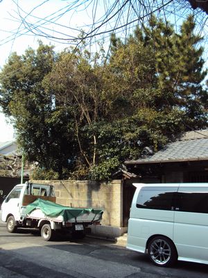重機の入れないせまいところで大きくなったシイの木の伐採です。