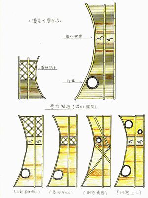 昔ながらの袖垣はどっしりとした重厚感のあるものが多いですが、「厚くて太い丈夫な材料でつくらないと長持ちしない(特に、雨ざらしでは)」というのがひとつの理由です・・・こういった袖垣は、伝統的な建築にそえるとやはりひきたつのですが、現在の住宅には、少し重い感じもあります。