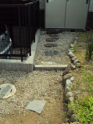 シートの上に砂利をしきつめ、工事完了です。