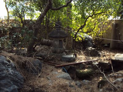 植木が生い茂り、多くの庭石がすえてあります。