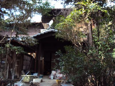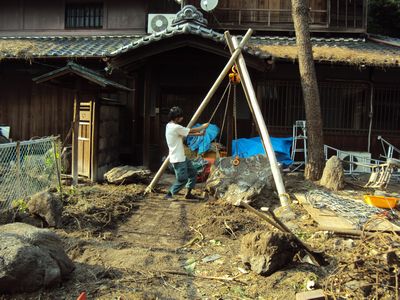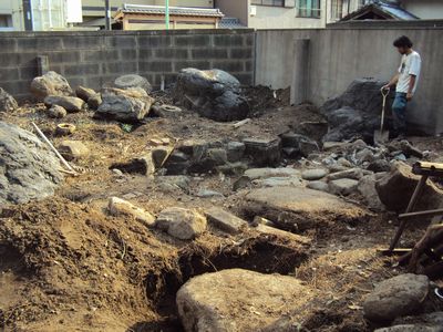植木の伐採をほぼ終え、庭石を運び出す前準備をしています。