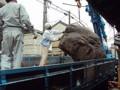 庭石はクレーンを使って運び出します