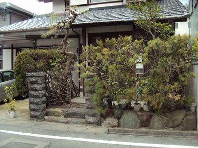 こんもりとふくらんでいたカイヅカの枝をすかし、残った枝をシュロ縄で家側にひっぱることで、道路にはみ出た枝をかなりちぢめることができました。